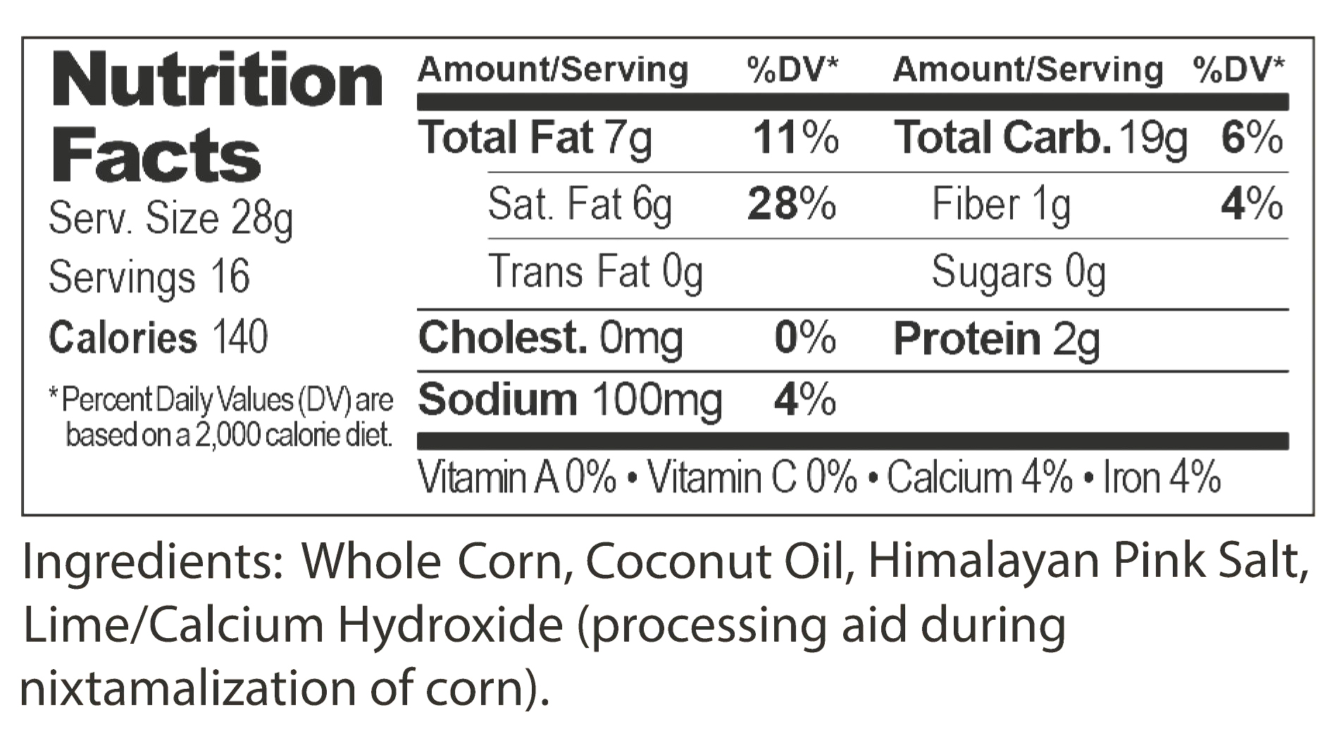 The simple ingredients are: Whole CornCoconut OilHimalayan Pink Salt, Lime/Calcium Hydroxide (processing aid during nixtamalization of corn).