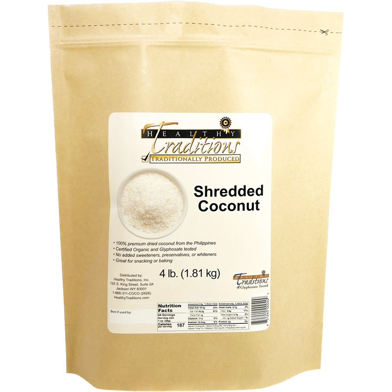 Tropical Traditions 100% natural Shredded Coconut is made from dried coconuts in the Philippines that are grown with no fertilizers or pesticides.