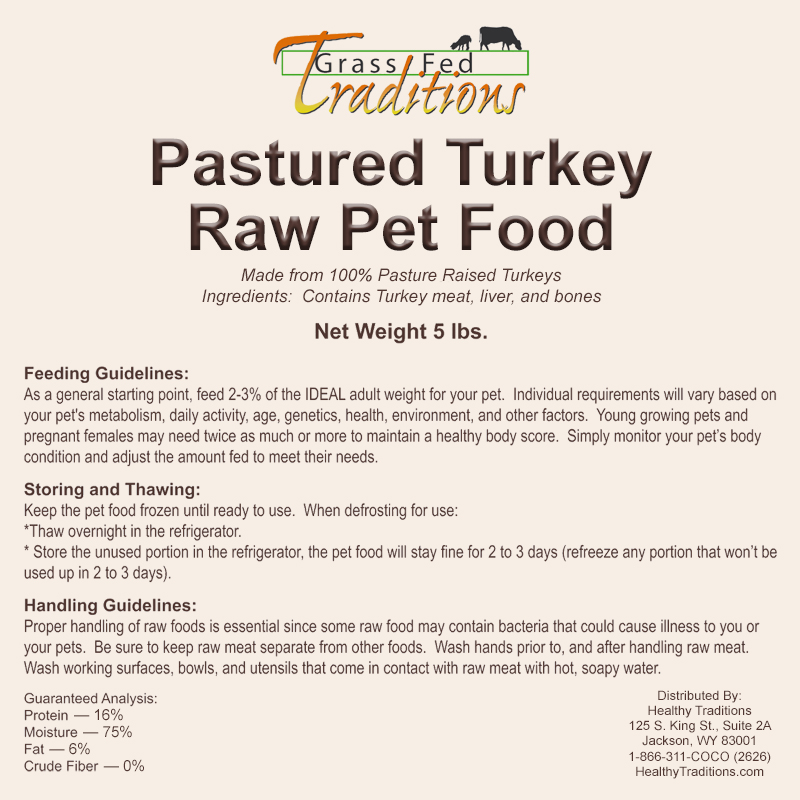 Pastured Turkey Raw Pet Food – 5 lb. – Our raw turkey chub is 100% ground turkey muscle, bone, and liver from human food grade turkeys. The turkeys were raised on pasture and fed a NON-soy diet, tested for glyphosate.