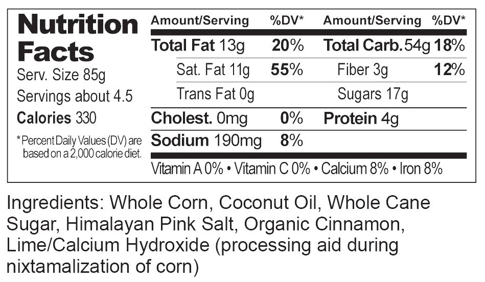 The simple ingredients are: Whole CornCoconut OilHimalayan Pink Salt, Lime/Calcium Hydroxide (processing aid during nixtamalization of corn).